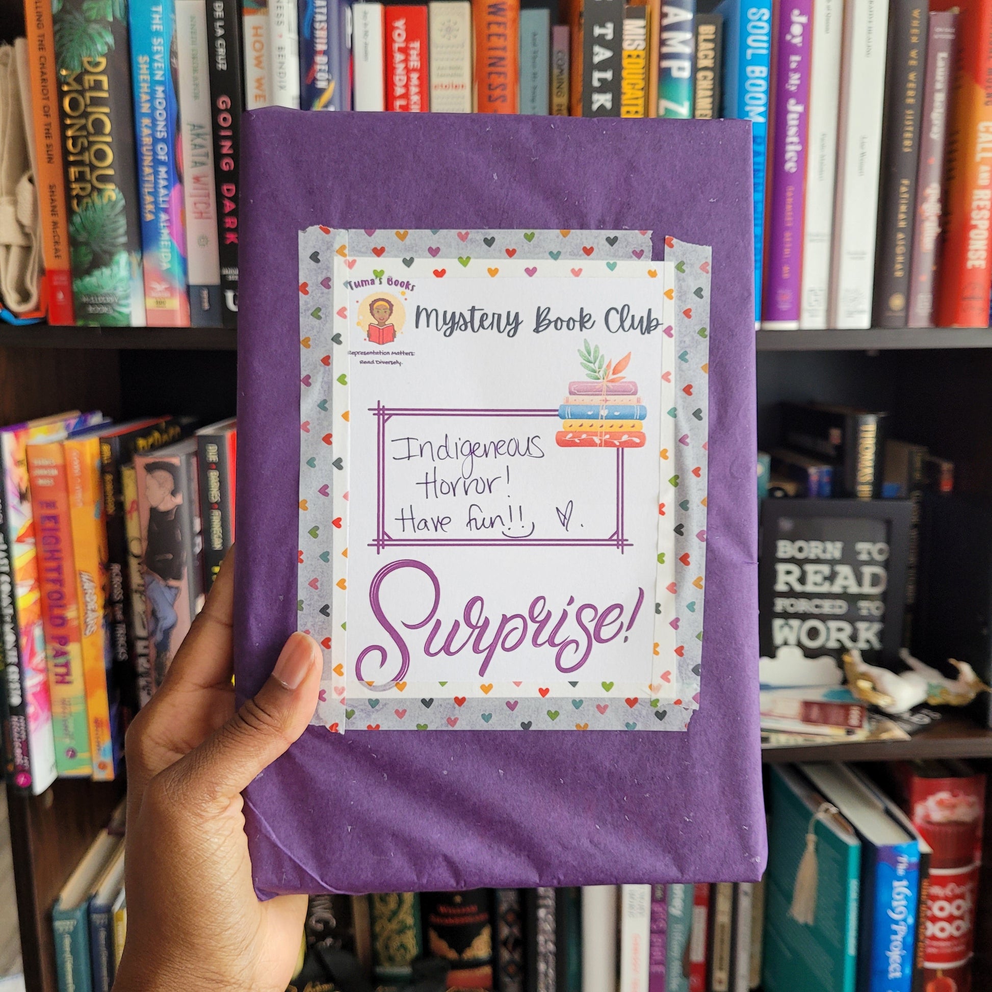 You'll receive a brand new diverse book that you might not have otherwise discovered! You will also receive a printed Book Review Card and 1-2 surprise gifts that could be stickers, bookmarks, pins, pens, notepads/postcards, post it tabs, tea, and/or more that I try to match to the theme of your surprise read. 💜