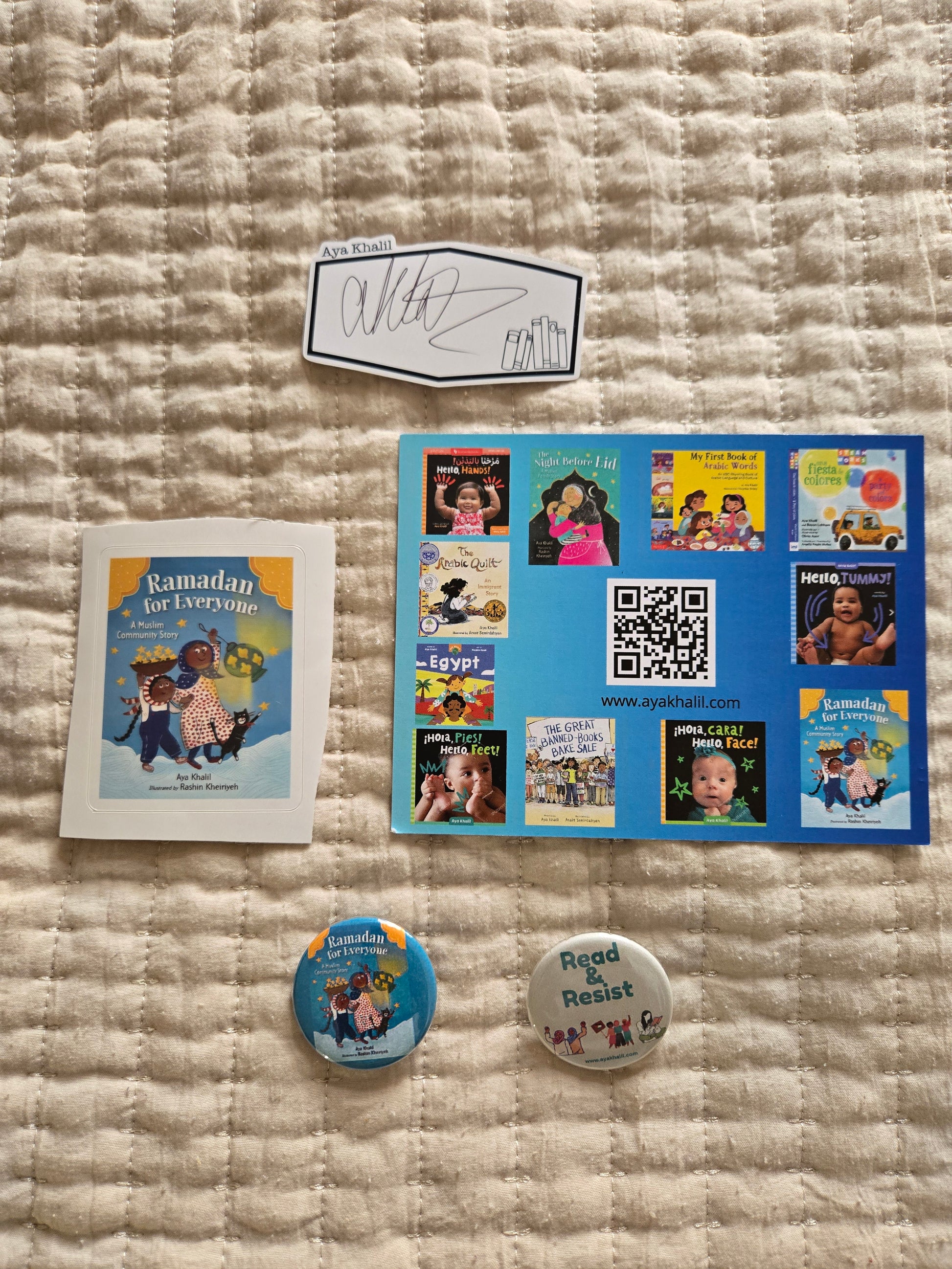 Comes with gifts from the author! Signed book plate, sticker, pins, and a postcard.